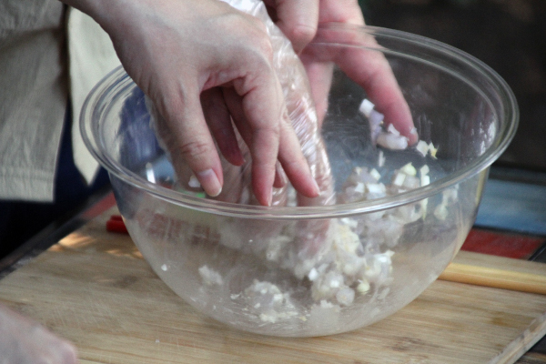 ボウルに長ねぎ・むき海老・調味料を入れて混ぜる。