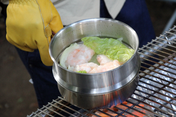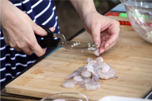 LOGOSシザーナイフで長ねぎをみじん切り、むき海老は粗みじん切りにする。