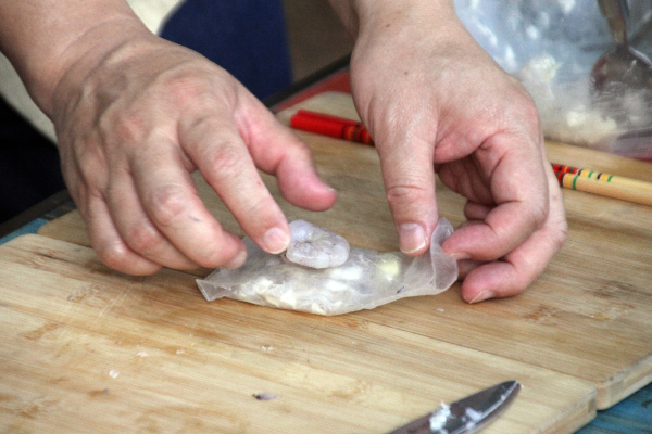 水で戻したライスペーパーで③を棒状に巻き、殻や背わたをとった尾付きの海老を重ねて包む。