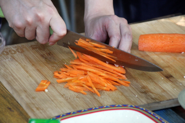 きゅうりを薄くスライスし、にんじんは細切りにし塩揉みする。にんじんはボウルに入れ、レモン汁とオリーブオイルで和えておく。