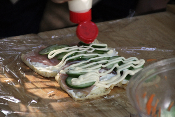 焼けた油揚げにクリームチーズをぬり、生ハむを乗せる。きゅうりを対角線上に並べ、マヨネーズをかける。