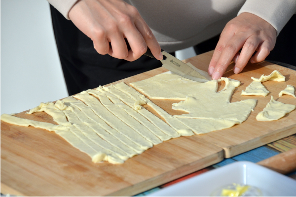 常温に戻した冷凍パイシートを2枚に伸ばす。1枚は半分を麺状にカットし、残り半分は装飾用のツリー型と星型に切り抜く。