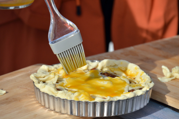 カスタードクリーム・リンゴの順で入れ、上から飾り付け用のカットしたパイシートをのせて、ハケで卵黄を塗る。
