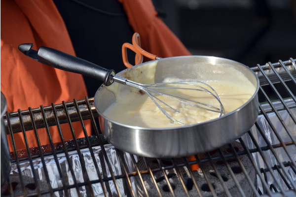 小鍋に三温糖・卵黄・薄力粉を入れたら牛乳を少しずつ加え、混ぜ合わせながら粘り気が出るまで加熱しカスタードクリームを作る。