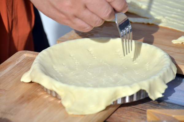 型に伸ばしたパイシートをしき、フォークで穴を開ける。型からはみ出した部分は1cm程度残してカットする。