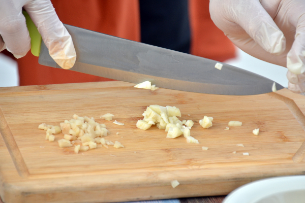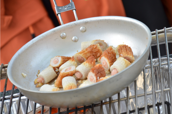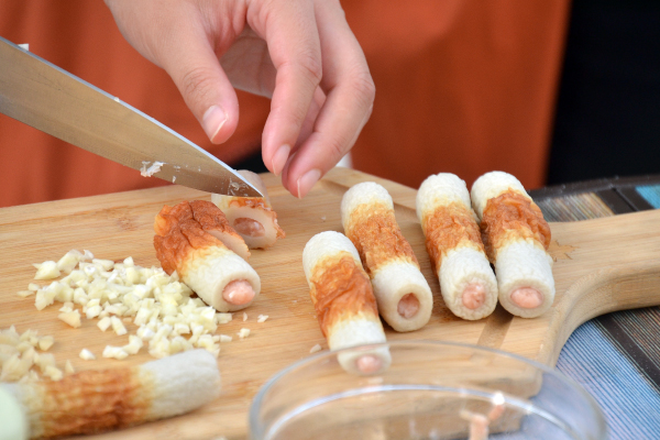 ひき肉を詰めたらちくわを食べやすい大きさ(3等分程度)にカットする。