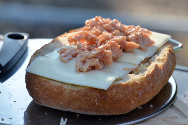 パンの中にサラダチキン、スライスチーズの順番で交互に重ねパンで蓋をする。