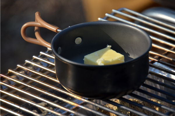 小鍋にバターと刻んだニンニクを入れてバターが溶けるまで加熱する。