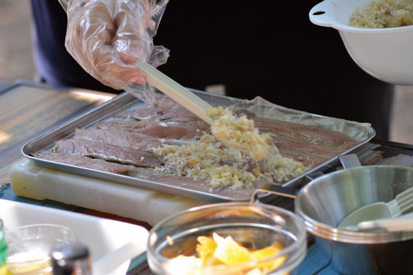 イワシの皮面を下にしてパン粉を乗せる。