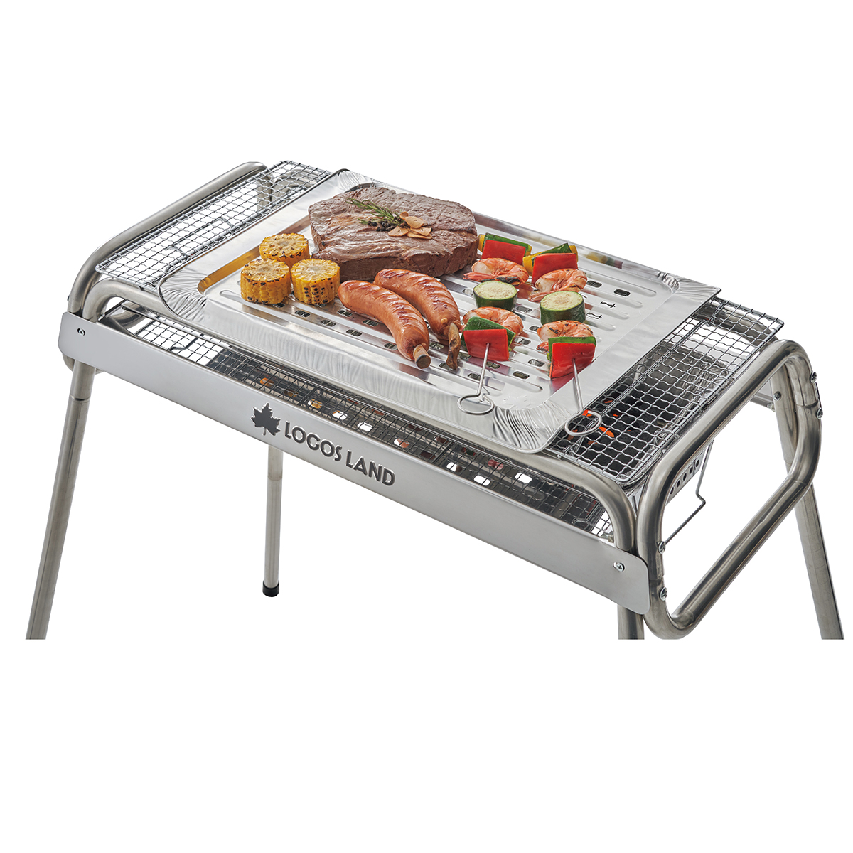 調理しやすい高さ80cmを採用。スライド式の火床は、炭の継ぎ足しが簡単にできるうえ、フックを本体にかけることで、遠火と近火の火力調節も可能。ロースタイル時には高さを41.5cmに変えられるので、シーンに応じた使い方ができる。