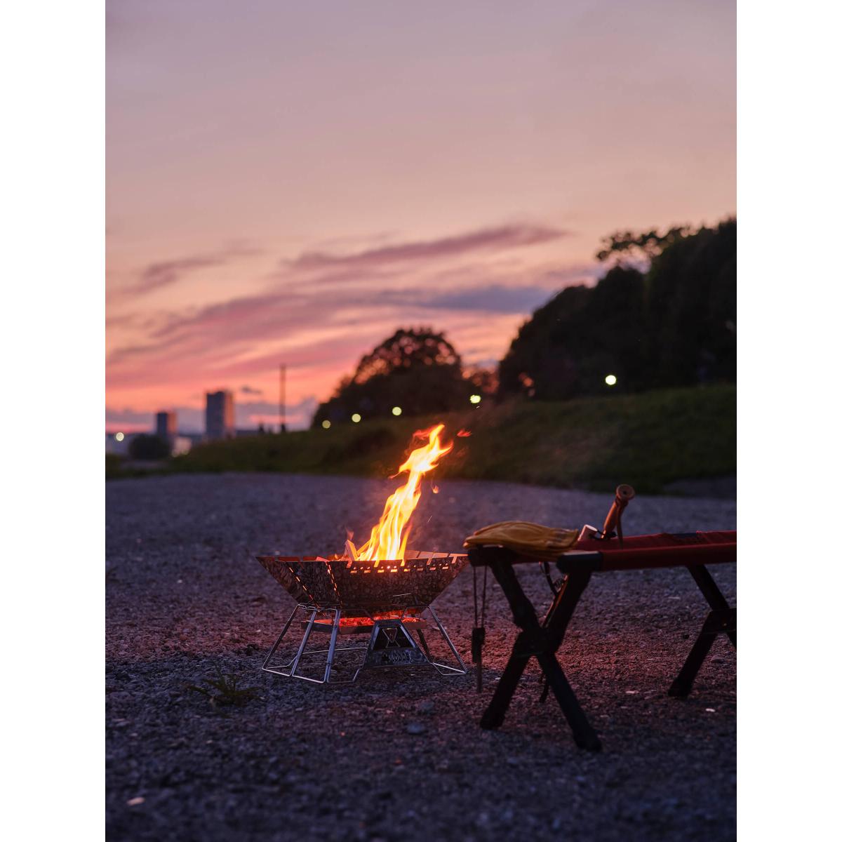 たき火やダッチオーブン料理が楽しめる焚き火台。別売りの焼き網をセットしてBBQも可能。折りたたみ式のパーツを開いて重ねるだけで、設営も撤収も10秒で完了するお手軽さ。別売りの「囲炉裏テーブルシリーズ」とセットで使えば、昔ながらの囲炉裏の雰囲気を味わえる。
